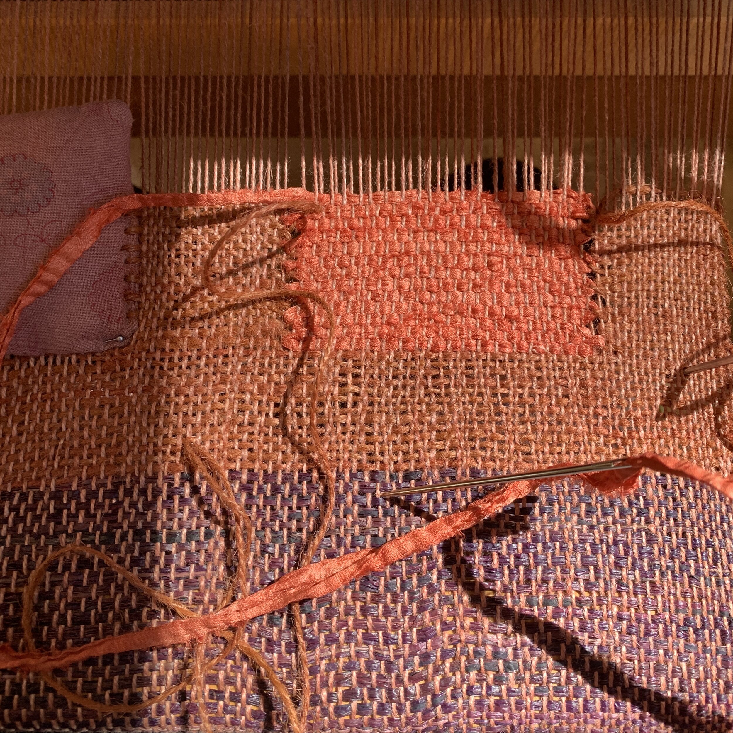 Using a combination of weaving, quilting, and natural dyeing techniques, I create forms and textures that are reminiscent of those found in the natural world. Flat weaves are given tactile dimension through the incorporation of stuffed and quilted repurposed fabrics that are stitched into the warp of some and woven into the weft of others to reference layers of lichen on stone or the rocky landscape of a shoreline.